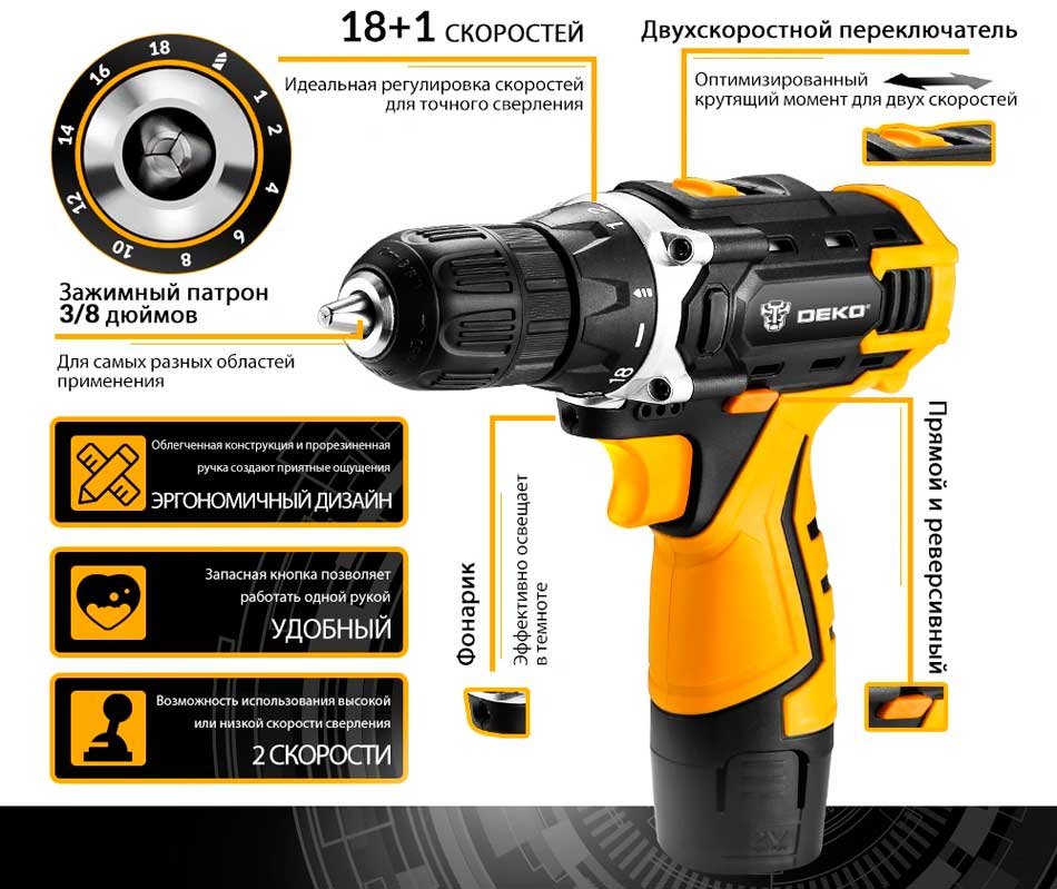 Шуруповерт акумуляторний дриль Deko 12В Li-ion 1350об 2скорости 28Н/м