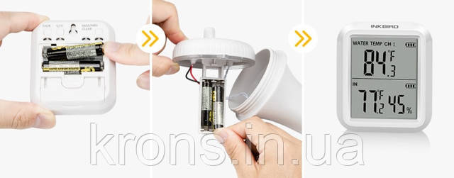 - Харчування: 4 батарейки ААА (за 2 батарейки в термометр-поплавок і датчик, до комплекту не включено)