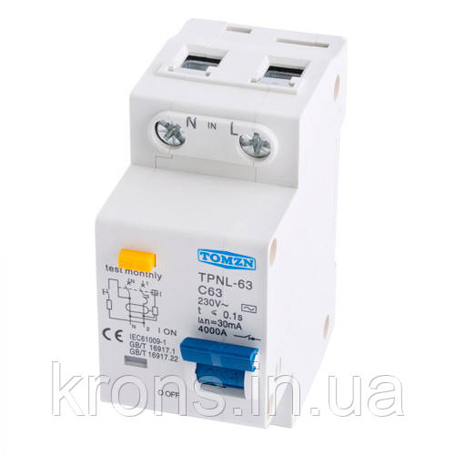 Диференціальний автоматичний вимикач TOMZN TPNL-63-C63 для змінного струму з вбудованим захистом від надструмів. Пристрій визначає струм, що виник у мережі, витоку більше встановленого настроюванням і вимикає живлення. Унаслідок чого відбувається захист від можливих струмів витоку на землю в електропровідці або використовуваних електричних приладах.